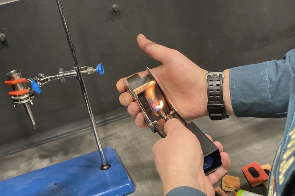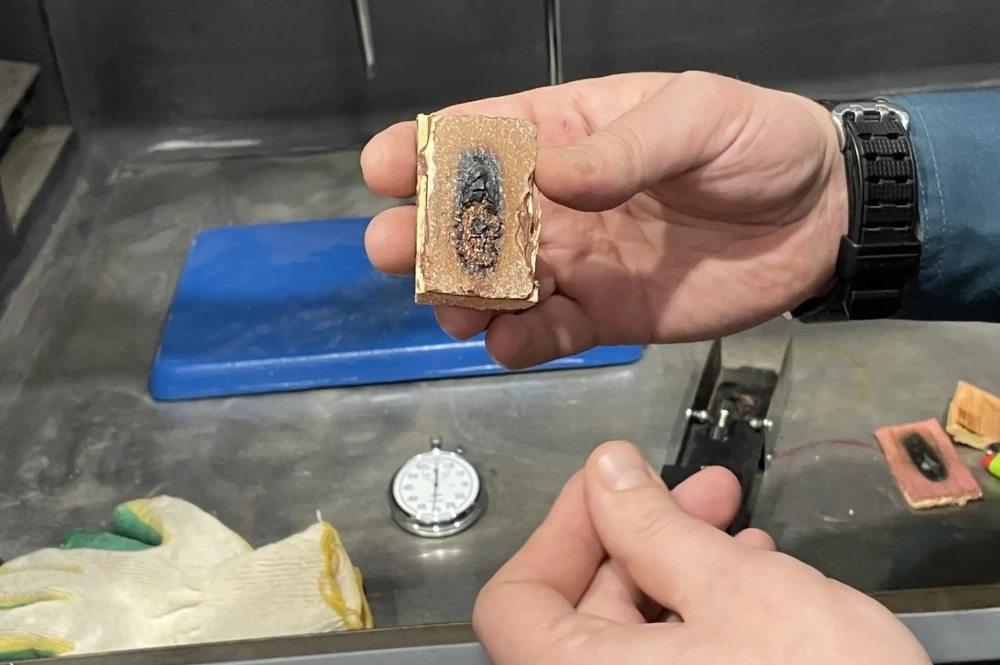 В лаборатории проверяют качество огнебиозащитной обработки деревянных конструкций. В течение 45 секунд деревяшку пытаются поджечь, и если обработка хорошая, то дерево просто обуглится, но не загорится. Такая защита зданий необходима, чтобы во время возгорания конструкции держали огнестойкость до прибытия пожарных. Кстати, этот защитный слой нужно обновлять каждый 3-5 лет или ежегодно проверять качество обработки в лаборатории.